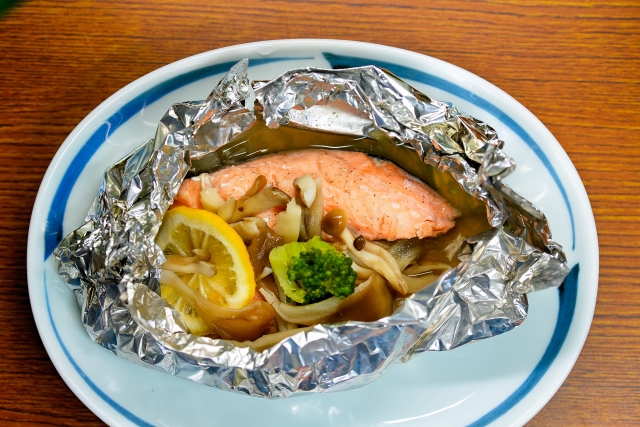 今日の朝ごはん、秋鮭のホイル焼きにしよっかニャ!